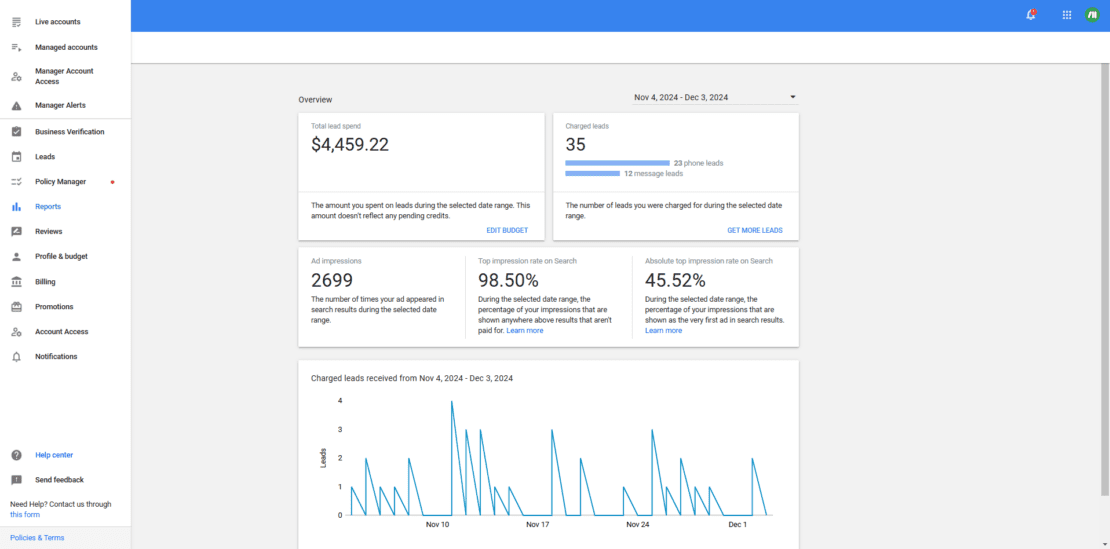 - Google Ads offers more detailed reporting and analytics compared to the LSA app. Utilize these tools to track key performance indicators (KPIs) like cost-per-lead (CPL), call response rates, and booking conversions. These insights can guide optimization efforts to improve ROI.